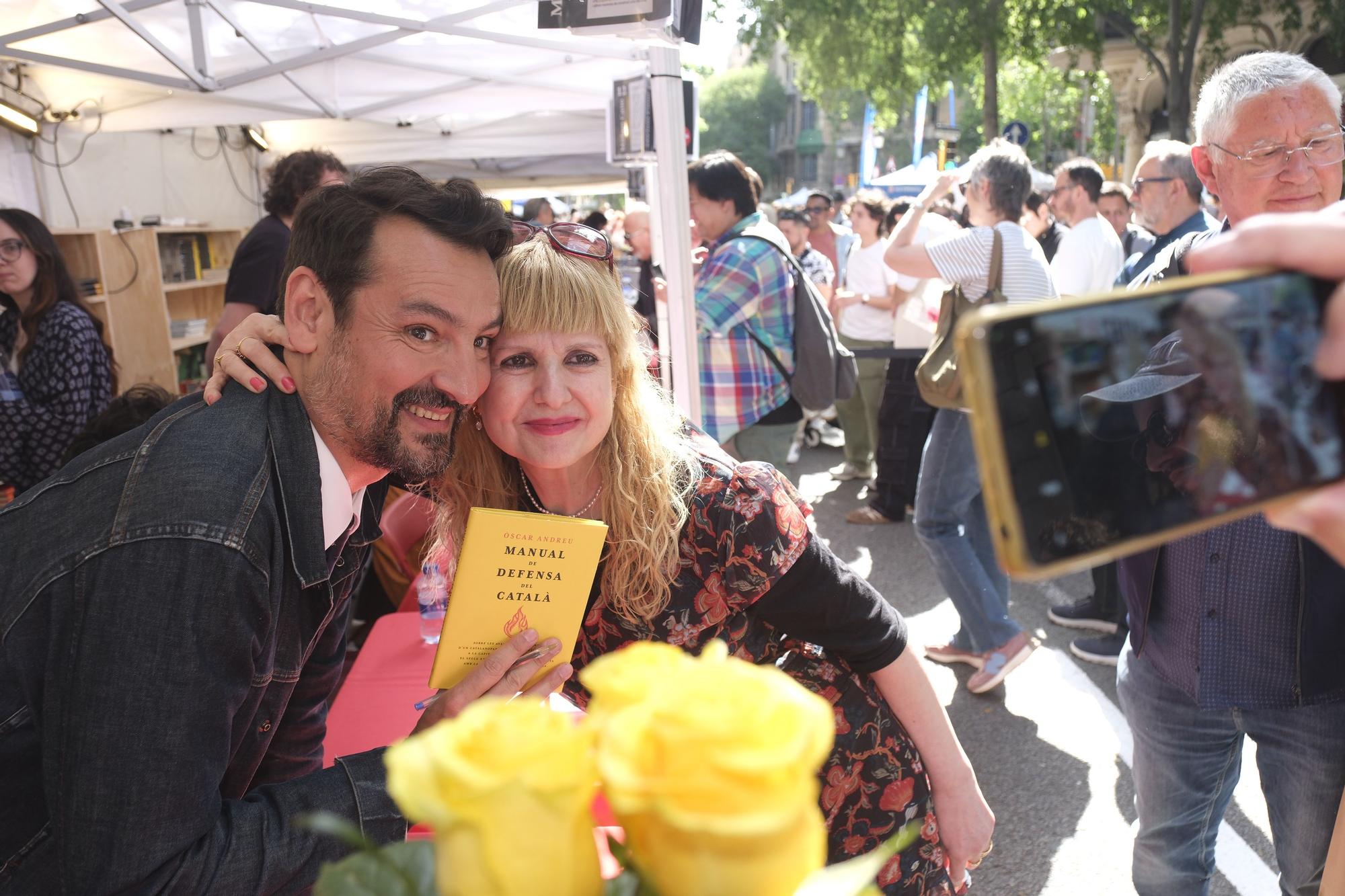 Èxit absolut de l'humorista i comunicador Òscar Andreu aquest Sant Jordi amb Manual de defensa del català (Univers): ha començat a signar a la parada de Plataforma per la Llengua i s'ha format una cua d'un centenar de persones. El llibre va sortir el 7 d'abril en una edició de 16.500 exemplars. A Plataforma per la Llengua ha exhaurit existències. Mentre una lectora li explicava històries familiars relacionades amb l'aprenentatge del català, Andreu no aixecava el cap del llibre i continuava signant sense descans. Impossible parlar amb ell. “M’agrada el seu humor, i tot el relacionat amb la llengua m’interessa”, afirma un lector, Carles Vila. “Visca el català i visca Catalunya!”, exclamen una parella, el Miquel i l’Emma, mentre Òscar Andreu els signa el seu exemplar.