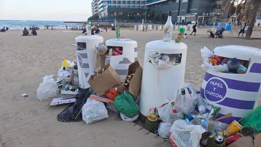 La playa del Postiguet, con la llegada del verano cada vez más cerca, ha dejado este domingo una imagen poco higiénica. Los cubos de basura de las pasarelas han pasado toda la jornada repletos de basura.