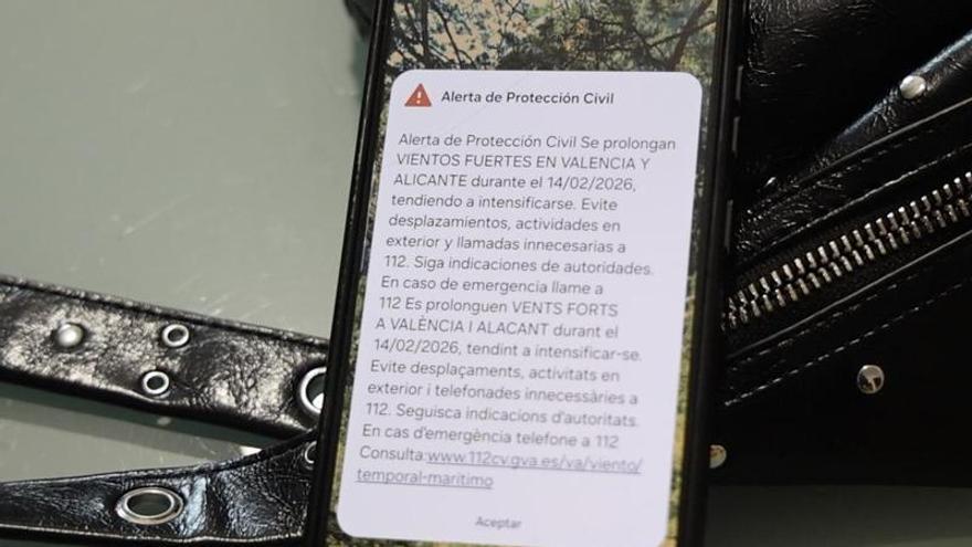 Todos los móviles de la provincia han pitado al unísono: a las 18.10h de esta tarde un Es-Alert ha sido enviado a toda la población para advertir de las fuertes rachas de viento huracanado que está previsto para mañana sábado 14 de febrero en toda la provincia de Alicante, que se encuentra en aviso naranja.