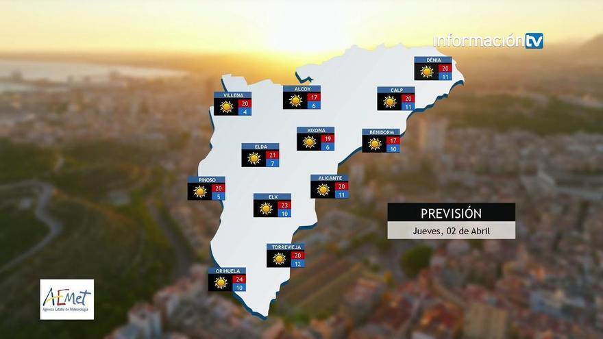 La provincia disfrutará de una jornada de tiempo estable y cielos despejados, sin precipitaciones y con ambiente plenamente soleado según indica la Agencia Estatal de Meteorología. La temperatura máxima más alta para este Jueves Santo se registrará en Orihuela, con 25 grados (más calor que en días anteriores) ,seguida de Elche y Elda donde se llegará hasta los 22 grados. La mínima más baja se dará en el interior, en Elda y Alcoy, con 5 grados.