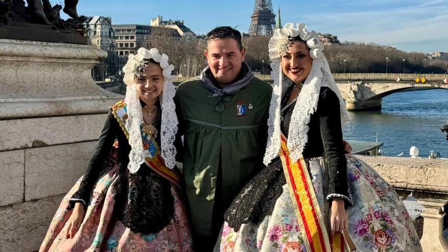 Las Belleas del Foc, Adriana Vico y Valentina Tárraga, junto al presidente de la Federació de Fogueres de Sant Joan, David Olivares, ya se encuentran en París, donde este fin de semana participan en los actos organizados por la Casa Regional Valenciana en la capital francesa.
