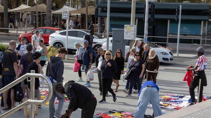 Largos días de sol, playas hasta la bandera y vendedores ambulantes sin licencia. Es la estampa que se produce habitualmente en el entorno de El Postiguet y el paseo del puerto, que se ha intensificado en los últimos días con la llegada del buen tiempo y la Semana Santa. Junto al litoral más céntrico de Alicante, se amontonan los puestos irregulares de camisetas, pareos, bolsos y todo tipo de productos textiles, además de complementos como gafas de sol y hasta servicios de "peluquería", con peinados en forma de trenzas. Alrededor de las toallas, además del sonido de las olas se escucha otra banda sonora: "¡Mojito, cerveza, Coca-Cola!".
