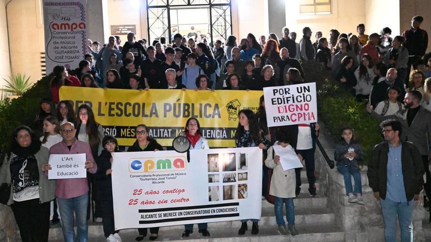 Familias y alumnos salieron este miércoles a la calle para reclamar un conservatorio digno y unificado en Alicante. En las escalinatas de las instalaciones del Tossal la comunidad educativa aseguró sentirse "ignorada y maltratada" por la Administración tras 25 años de promesas incumplidas.