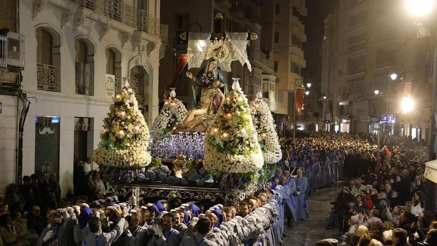 La Real Academia Española define en su primera acepción una promesa como la expresión de la voluntad de dar a alguien o hacer por él algo y en la tercera como el augurio, indicio o señal que hace esperar algún bien. Este Lunes Santo cientos de promesas acompañaron a la Virgen de la Piedad por las calles de Cartagena como materialización de estas ideas para pedirle a una de las imágenes más queridas de la Semana Santa cartagenera que cumpliera sus deseos o en agradecimiento por haberlo hecho ya. La primera procesión de la cofradía Marraja salió sobre las nueve de la noche de la Iglesia de Santa María de Gracia, desde donde partió en dirección a la calle del Aire para continuar su recorrido hasta regresar de nuevo al templo.