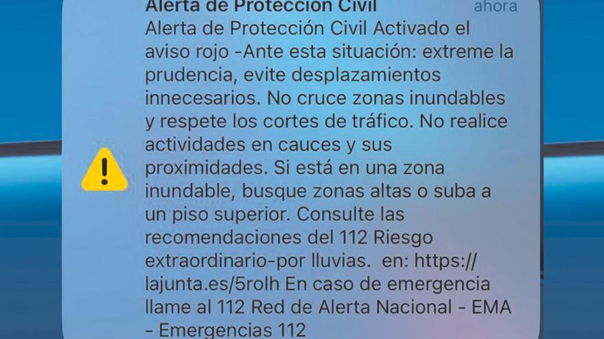 Pasadas las 21.15 horas de la noche de este viernes, poco después de conocerse el aviso de la Aemet subía a rojo, la Junta ha activado el sistema ES-ALERT en la provincia de Málaga, a través del cual han llegado a los teléfonos móviles un mensaje de Protección Civil alertando de la situación prevista de alerta roja y recomendando prudencia y evitar desplazamientos innecesarios. La alerta ha sido enviada a 27 municipios.