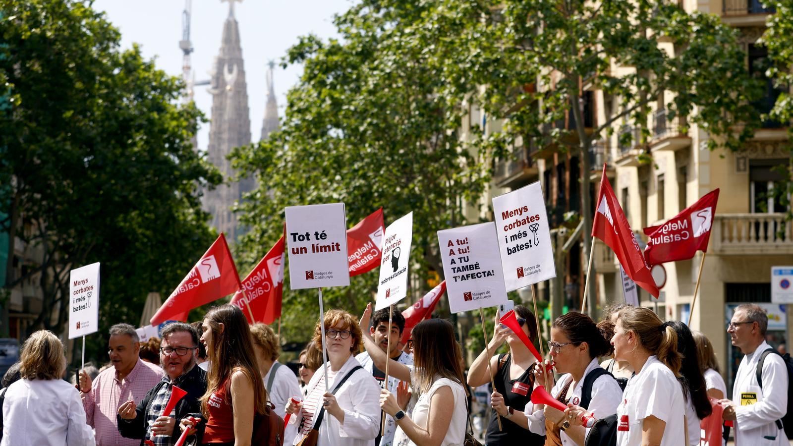 Una munió de bates blanques s'han manifestat aquest dilluns al matí pel carrer Sardenya de Barcelona, a l'entorn de la Sagrada Família, per reclamar –per desena vegada des de la tardor– un conveni sanitari que reguli exclusivament les condicions dels metges. Davant de desenes de turistes desorientats que igualment fotografiaven la protesta, mig miler de metges han reclamat de nou millores en les condicions laborals tant a la conselleria de Salut com al ministeri de Sanitat, als quals acusen d'ignorar les seves reivindicacions. "Mantindrem la pressió fins al límit de les nostres forces", ha afirmat el secretari general del sindicat, Xavier Lleonart.