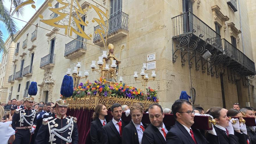 Alicante acudió este sábado a su cita anual con San Nicolás, patrón de la ciudad. Una amplía comitiva de autoridades civiles y eclesiásticas, así como una nutrida representación de las fiestas de la ciudad y, en particular, de sus niños, han conformado una procesión que recorrió desde la concatedral de San Nicolás hasta la plaza del Ayuntamiento.