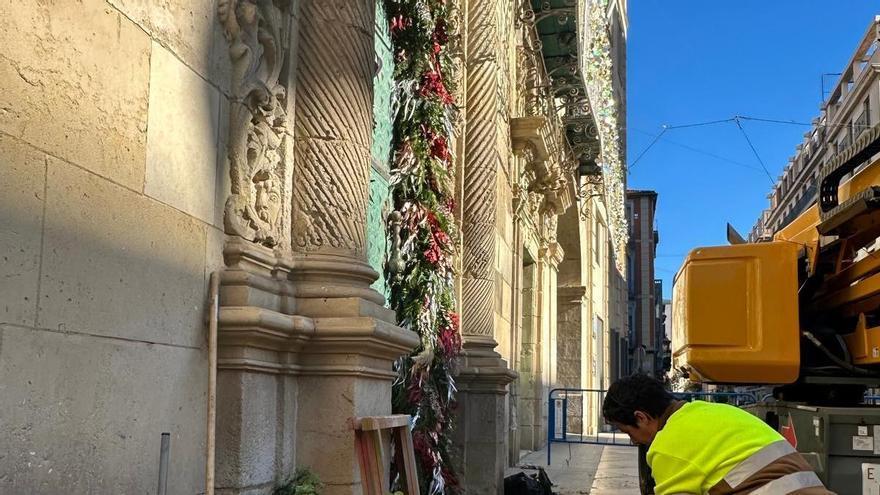 Alicante ha comenzado a vestir de Navidad el edificio del Ayuntamiento de Alicante, con la instalación de una decoración floral en la fachada de la Casa Consistorial. Los trabajadores de STV Gestión, empresa encargada por el departamento de Zonas Verdes de la concejalía de Parques y Jardines han colocado este viernes en la fachada dos arcos y otras tantas columnas navideñas. Estos adornos están elaborados con material vegetal natural y presentan un fondo verde, decorado con los colores tradicionales de la Navidad: plata, cobre y oro viejo.