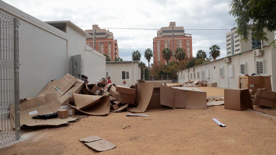 Barracones entre cajas de cartón. Así asisten cada día a clase los alumnos del nuevo colegio de Alicante, bautizado con el Número 56. Poco o nada ha cambiado la imagen del primer día que se llevaron los escolares de este centro educativo de Infantil y Primaria y sus familias. Un centro que la Conselleria de Educación decidió abrir íntegramente en prefabricadas y a contrarreloj, en el barrio del Pla-Garbinet, para atender la llegada de estudiantes fuera de plazo, la mayoría de ellos procedentes de fuera de España.