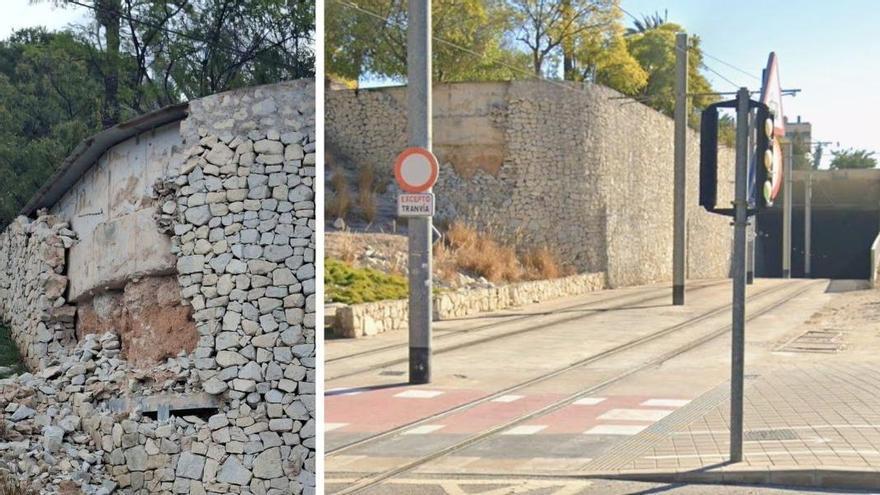 Un muro de contención junto a las vías del TRAM de Alicante permanece derruido desde hace casi tres años, cuando sufrió un derrumbe a consecuencia de un episodio de fuertes lluvias. Pese a que el proyecto de reparación se redactó ese mismo año y a la existencia de diversos informes de la Generalitat instando a su reconstrucción urgente, la situación no ha sido revertida.